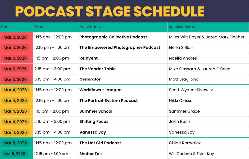 Across three days, you’ll hear unfiltered discussions with working photographers, educators, brand leaders, and creative voices who are actively influencing where photography is headed next. From business strategy and marketing shifts to creative evolution and real-world experiences behind the camera, these sessions are designed to keep you informed, inspired, and ahead of the curve.